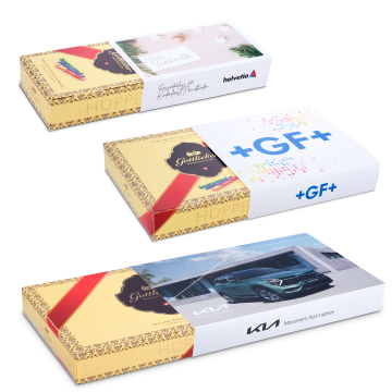 Sie können alle 3 Seiten des Stulpkartons bzw. 1 Seiten des Mini-Reiters individuell nach Ihren Vorstellungen gestalten: mit einer persönlichen Grussnachricht oder zum Beispiel mit Firmenlogo und eigenem Sujet. Lassen Sie Ihrer Kreativität freien Lauf!