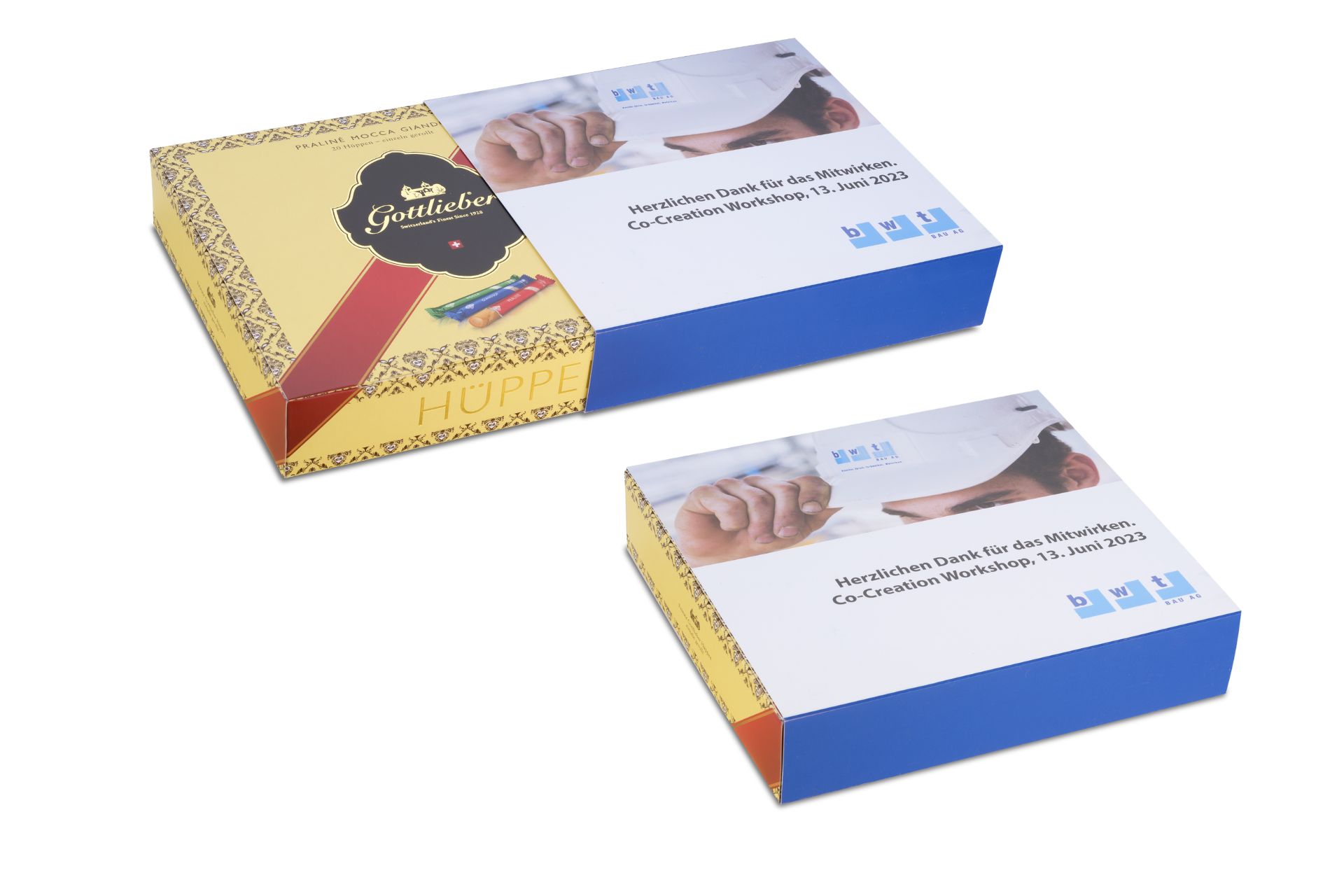 Die beliebten Stulpkartons können mit Hüppen in den folgenden Geschmacksrichtungen und Formaten kombiniert werden.