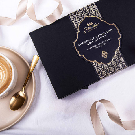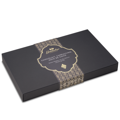 Die assortierte Mischung der drei Hüppen-Varianten Chocolait, Cappuccino und Noix de Coco der Royal Edition ist auch als GRANDE in einer exklusiven Geschenkverpackung erhältlich.