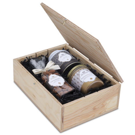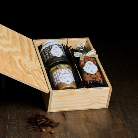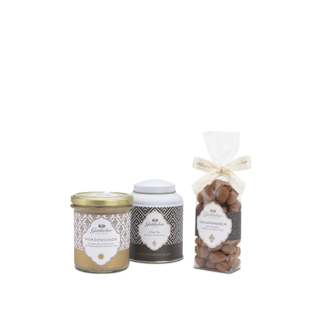 Das Gourmet-Holzkistli ist gefüllt mit drei exquisiten Gottlieber Spezialitäten und erfreut die Seele und den Gaumen gleichermassen. Die Gottlieber «Morgensünde» - unser hausgemachte Brotaufstrich aus feinster Pralinécrème, angereichert mit Hüppenstückchen und Schweizer Alpensalz - verwöhnt auf einem Stück Zopf oder Brot. Dazu ein Säckli gerösteter Gottlieber Cacaomandeln, die sorgfältig mit feinster Schokolade umhüllt und edlem Cacaopulver bestäubt werden. Zum Abschluss unser «Herzschmeichler» – ein Chai-Tee aus Yogi- und Schwarztee mit feinen Gewürzen, der das süsse Duo optimal ergänzt.