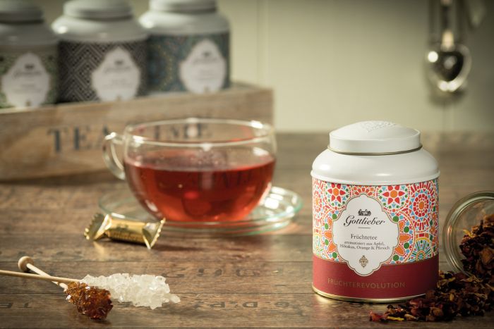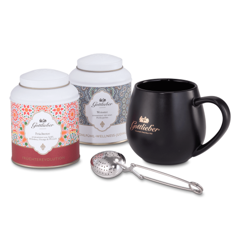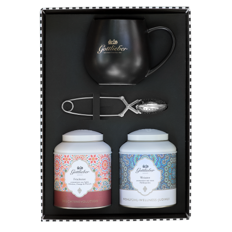 Die saftigen Pfirsichstücke und ein Hauch Vanille machen die «Früchterevolution»-Mischung ausgezeichnet. Ein aromatisierter Früchtetee aus Apfel, Hibiskus, Orange & Pfirsich. Natürlich reich an Vitaminen, Mineralien und Antioxidans - ohne Tein und Koffein. Für eine perfekte Zubereitung gibt es eine schwarze Gottlieber Tasse und ein Tee-Ei dazu. Alles sorgfältig angeordnet in unserem schönen Schatzkistli.