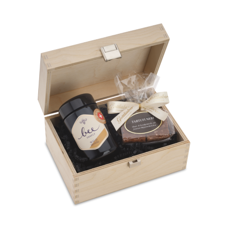 Verpackt in einer edlen Holzkiste ist dieses Set nicht nur ein kulinarisches Highlight, sondern auch ein stilvolles Geschenk mit Honig aus der Schweiz für jeden Anlass.