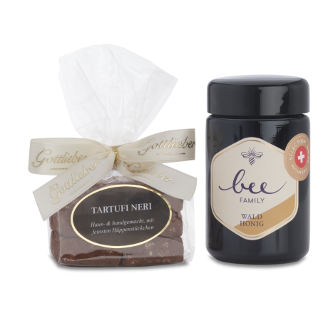 Das Holzkistli «Honig & Tartufi» ist gefüllt mit handgemachten Gottlieber Tartufi neri im Säckli und einem Glas Schweizer Waldhonig der Bee-Family.