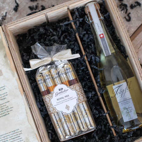 Ein Gottlieber Holzkistli mit einem «Royal Mix»-Säckli mit 10 Hüppen (Amaretto, Cappuccino & Irish Cream-Füllung) und einer Flasche alkoholfreiem Tröpfel (37.5 cl). Der alkoholfreie Schaumwein aus Thurgauer Trauben und Äpfeln ist eine Innovation zweier erfolgreichen Jungunternehmerinnen aus der Ostschweiz und wurde schon mehrfach ausgezeichnet.