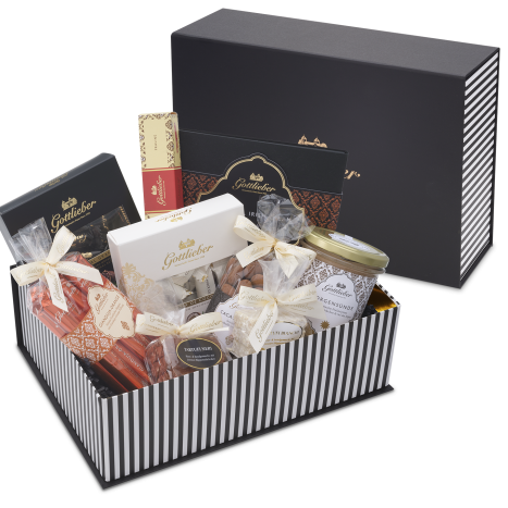 Die elegante Geschenkbox unseres Geschenksets «The very best of Gottlieber» mit schwarz-weissen Streifen und Gold-Inlay ist aus einem festen Karton mit Magnetverschluss und lässt sich für verschiedene Gelegenheiten wiederverwenden. Hier finden Sie ein paar Upcycling-Ideen. Erhalten Sie ausserdem in unserem Unboxing-Video des Schatzkistli 3: «Wir mögen es bunt» einen ersten Eindruck der eleganten Box.