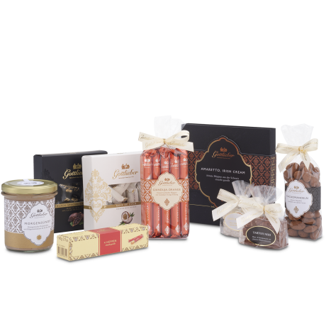 Gottlieber Praliné-Hüppen, exklusive Royal Hüppen in verschiedenen Varianten, handgefertigte Tartufi, unser beliebter, hausgemachter Brotaufstrich «Morgensünde», feinste Cacaomandeln und viele weitere Spezialitäten aus unserer Manufaktur haben wir in unserem Schatzkistli «The very best of Gottlieber» zusammengestellt.