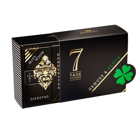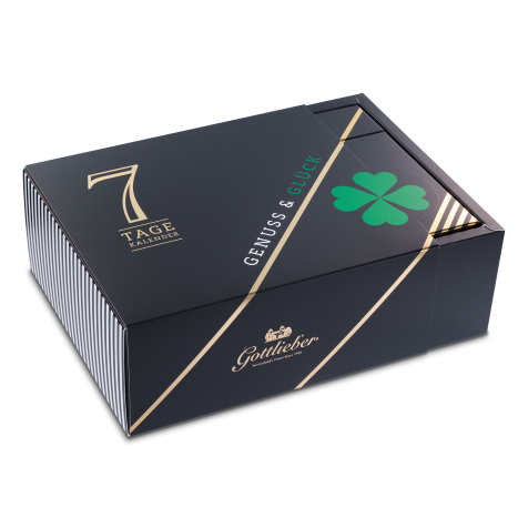 Eine Woche Glück verschenken! Der Gottlieber 7 Tage Genuss-Kalender «Genuss & Glück» vereint erlesene Köstlichkeiten unserer Zuckerbäckerei. In jeder der sieben Schachteln verbirgt sich eine süsse Überraschung: knusprige Hüppen, zart duftender Tee, verführerische Tartufi sowie die haus- und handgemachte Pralinécreme «Morgensünde». Die edle Goldprägung wertet den hochwertigen Kalender und Sleeve zusätzlich auf.