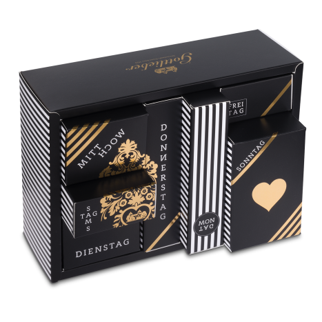 Eine Woche Liebe verschenken! Der 7 Tage Genuss-Kalender «Genuss & Liebe» vereint erlesene Köstlichkeiten unserer Zuckerbäckerei. In jeder der sieben Schachteln verbirgt sich eine süsse Überraschung: knusprige Hüppen, zart duftender Tee, verführerische Tartufi sowie die haus- und handgemachte Pralinécreme «Morgensünde». Die edle Goldprägung wertet den hochwertigen Kalender und Sleeve zusätzlich auf.