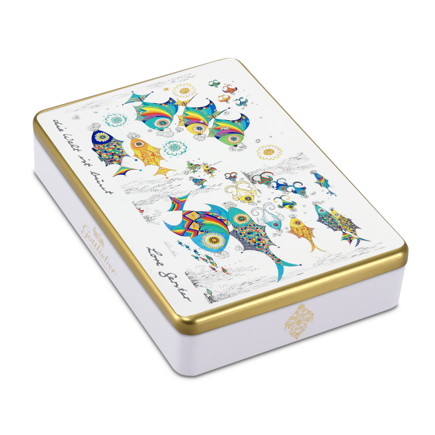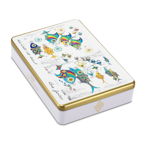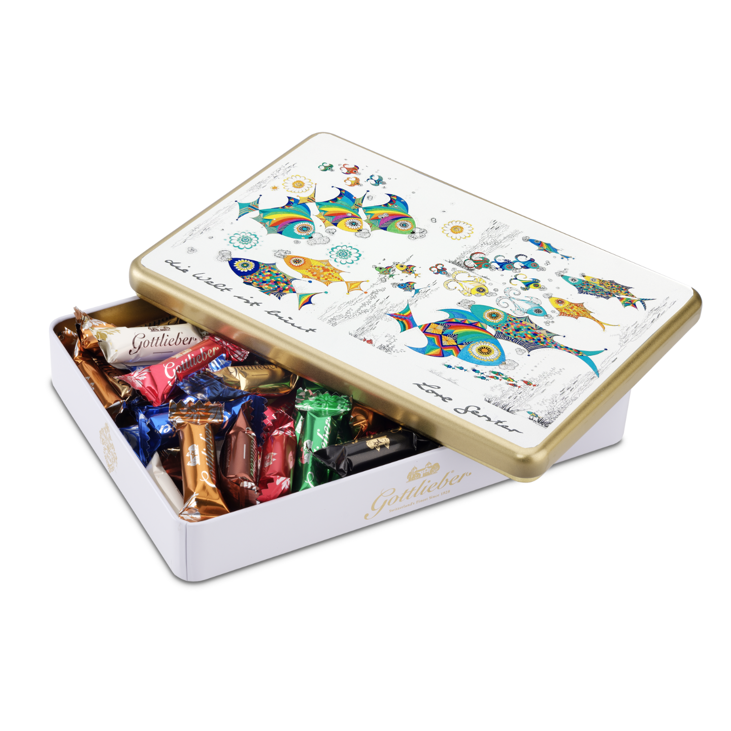 Mit ihrem Sujet «Die Welt ist bunt» entführt die Schmuckdose der Gottlieber Künstlerin Lore Gerster in eine farbenfrohe Unterwasserwelt – voller leuchtender Fische. Die Schmuckdose ist gefüllt mit acht Sorten feinster Gottlieber Mini-Hüppen: Praliné, Mocca, Gianduja, Vanille, Caramel, Mandel, Noix de Coco und Black Special Grand Cru.