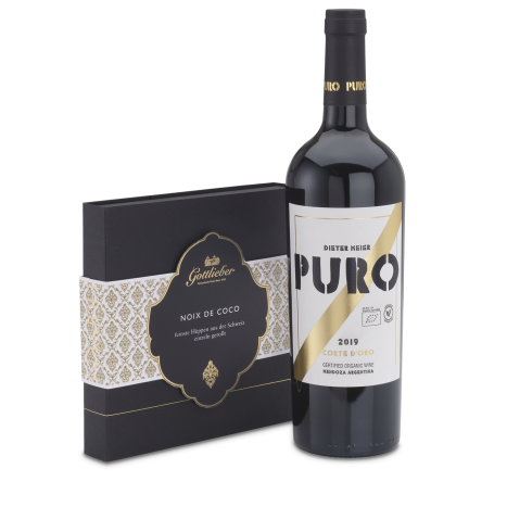 Feinste Noix de Coco Premium Hüppen kombiniert mit einer Flasche PURO Corte d’Oro (Mendoza, Argentinien) vom argentinischen Weingut Ojo de Agua des Yello-Stars Dieter Meier.