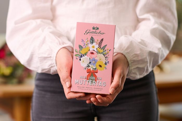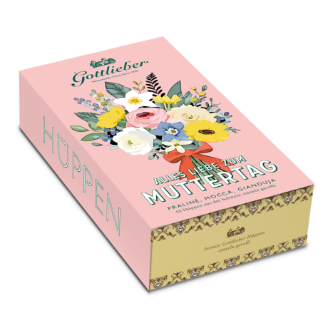 Überraschen Sie Ihr Mami mit unseren Gottlieber Hüppen im liebevollen Muttertagsdesign. Zeigen Sie Liebe, Dankbarkeit und wünschen Sie alles Gute zum Muttertag mit unserer beliebten Traditionsmischung (Praliné, Mocca, Gianduja).