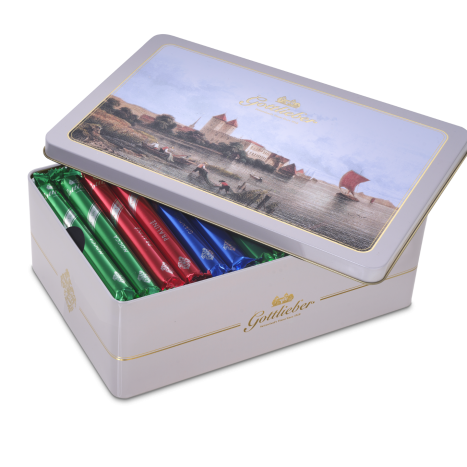 Die Schmuckdose «Gottlieben» ist gefüllt mit 56 feinsten Gottlieber Hüppen der Traditionsmischung (Praliné, Mocca, Gianduja).