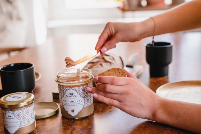 Wenn die hausgemachte Pralinécrème auf Hüppenstückchen & Schweizer Sel des Alpes trifft, entsteht ein unwiderstehlich feiner Brotaufstrich namens «Morgensünde».
