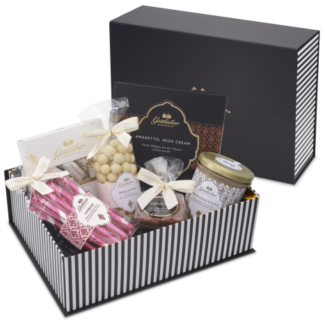 Die elegante Geschenkbox unseres Geschenksets «Süsser Alltag» mit schwarz-weissen Streifen und Gold-Inlay ist aus einem festen Karton mit Magnetverschluss und lässt sich für verschiedene Gelegenheiten wiederverwenden. Hier finden Sie ein paar Upcycling-Ideen. Erhalten Sie ausserdem in unserem Unboxing-Video des Schatzkistli 3: «Wir mögen es bunt» einen ersten Eindruck der eleganten Box.