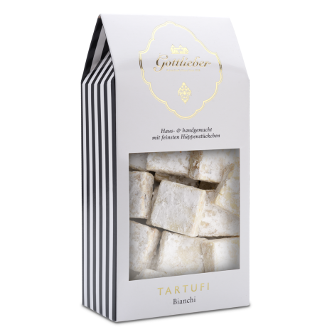 Neu erhältlich in unserer Tartufi-Serie: Tartufi bianchi «GRANDE» in der eleganten Kartonverpackung mit Gottlieber Design in schwarz-weissen Streifen und edlem Logo im Golddruck.