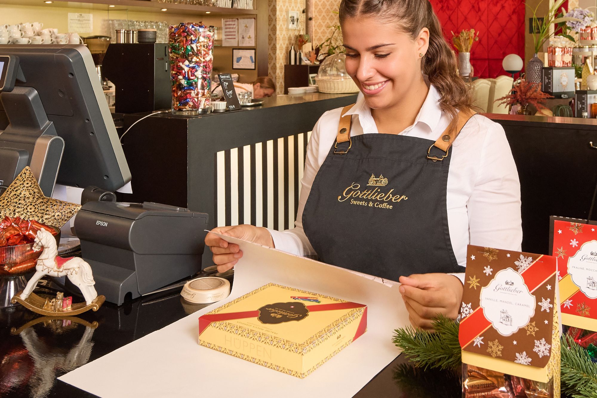 Im integrierten «Gottlieber Shop» können Sie feinste Gottlieber Hüppen und Schokoladenspezialitäten wie die haus- & handgemachten Gottlieber Tartufi, den verführerischen Brotaufstrich «Morgensünde», Cacaomandeln, Haselnüsse sowie auserlesene Tees kaufen.