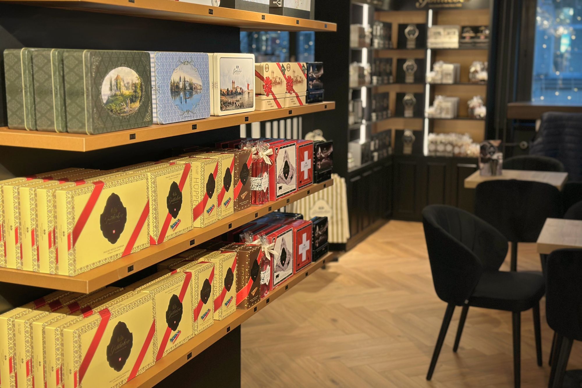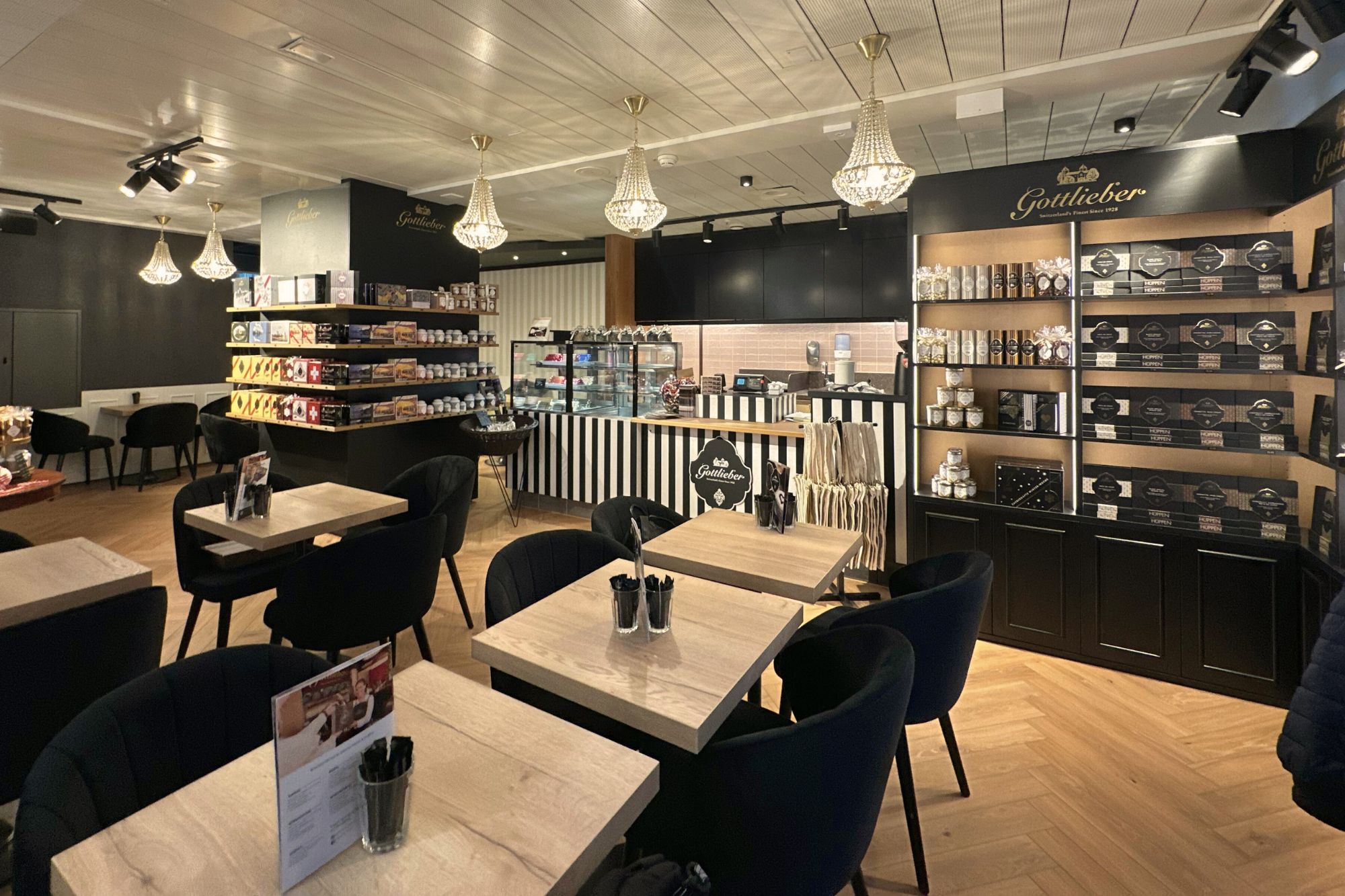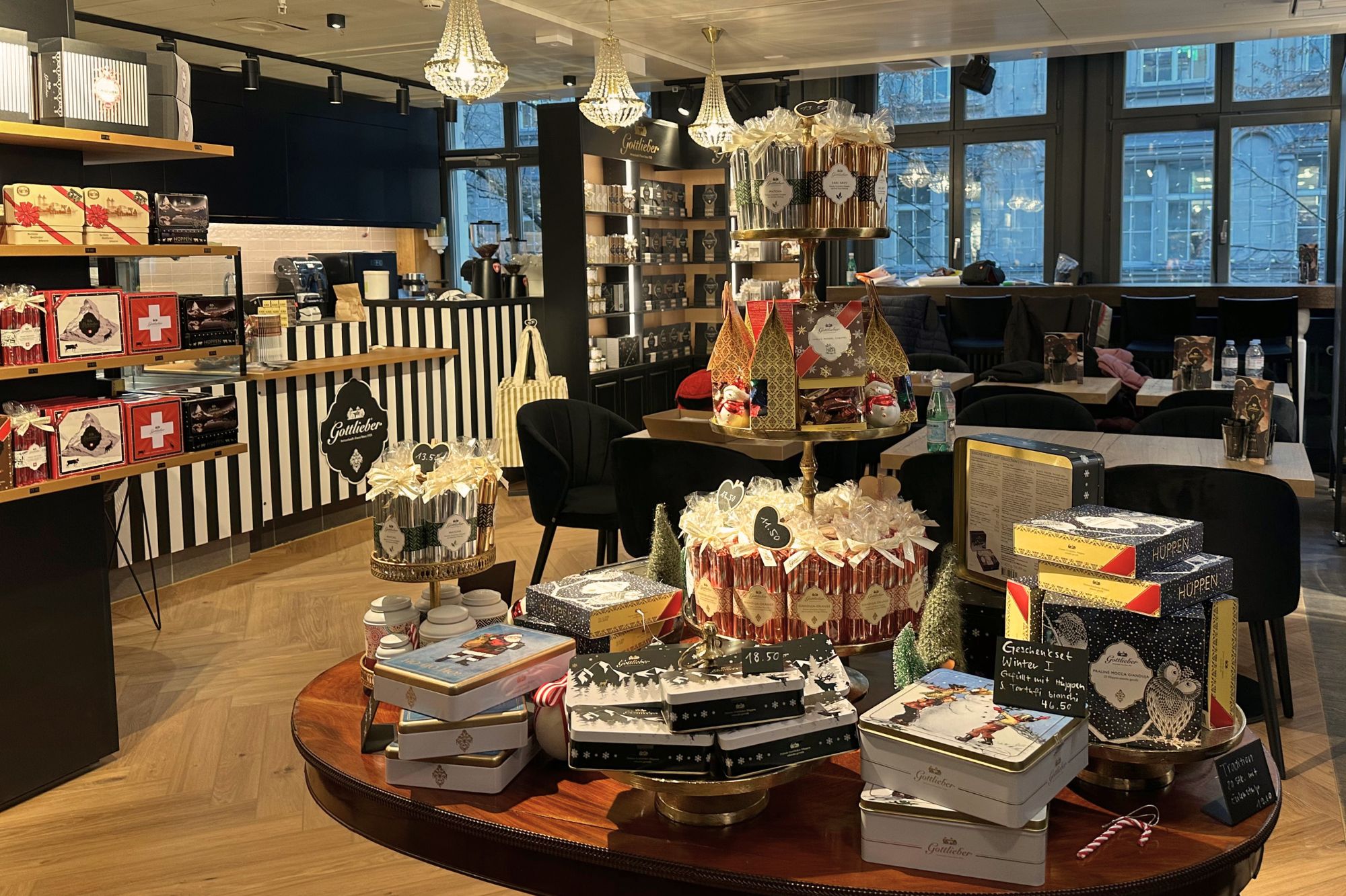 Zudem können Sie im integrierten «Gottlieber Shop» feinste Gottlieber Hüppen und Schokoladenspezialitäten wie die haus- & handgemachten Gottlieber Tartufi, den verführerischen Brotaufstrich «Morgensünde», Cacaomandeln, Haselnüsse sowie auserlesene Tees kaufen.