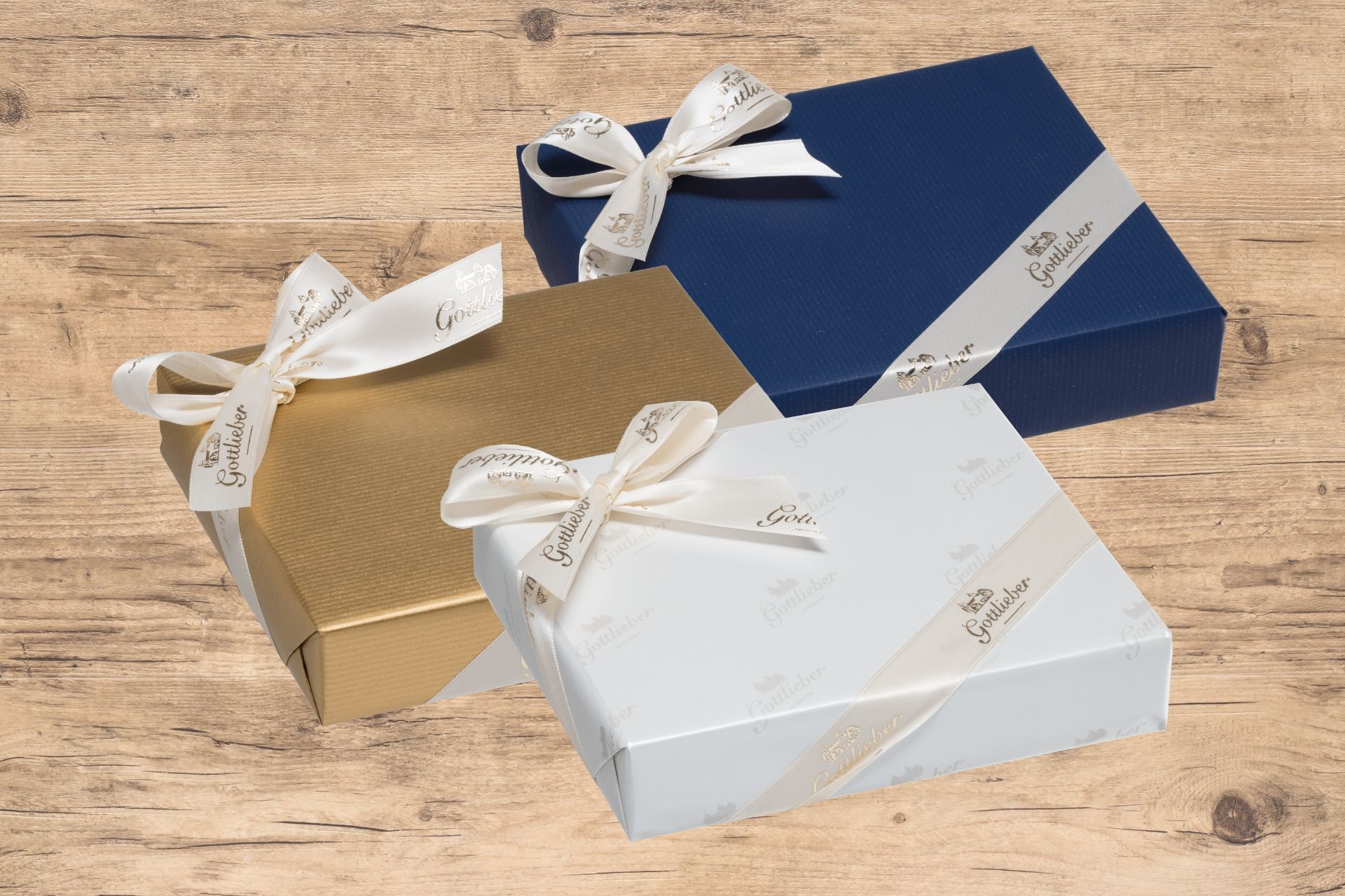 We’ll be happy to package your gift with no minimum order amount. Choose from different neutral paper variations, Christmas motifs, with or without a gift ribbon. Or order personalised gift ribbons featuring your logo. Upon your request, we can even have your logo inscribed onto the gift wrapping paper.