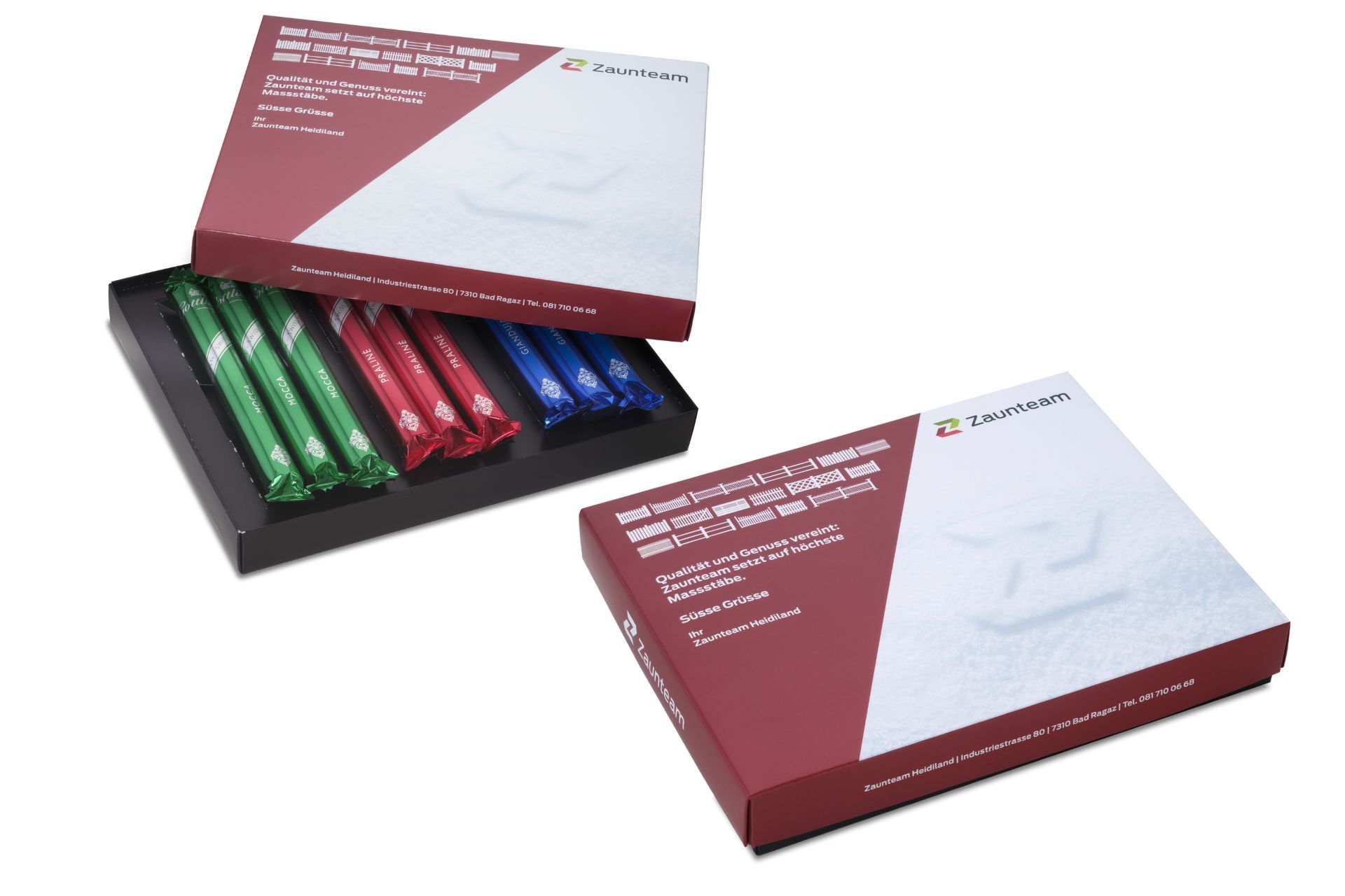 For the design, you can choose whether you want to customize the lid of the delicacy box or a carton sleeve with your design or build your delicacy box from the ground up in your company motif incl. the inner surfaces personalized from A to Z.