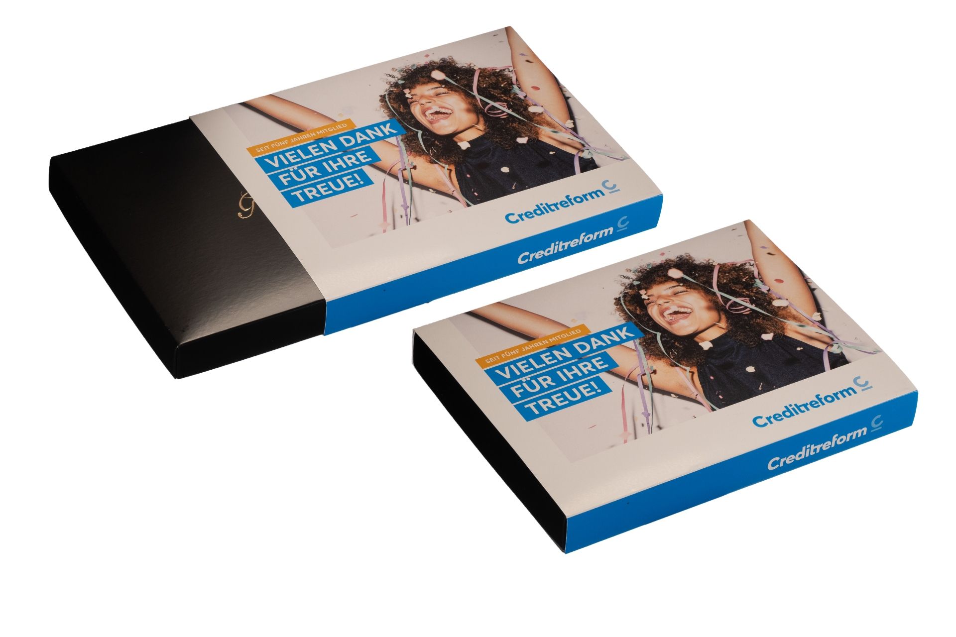 Customise the lid of the delicacy box or a carton sleeve with your corporate design or build your delicacy box from the ground up, including the inside surfaces. Mix and match your contents from our 14 taste variations (8 or 9 Hüppen). Thanks to the flat design – medium-sized letter with surcharge – you can save up to 65% in shipping costs.