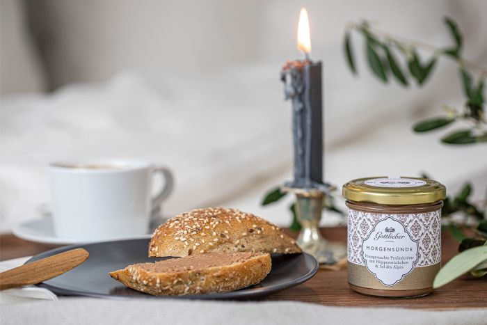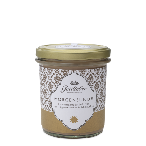 When the home-made praline cream meets Hüppen pieces and Swiss Alpine salt, an irresistible elegant spread by the name of «Morning Delight» is produced. Also available in mini size.