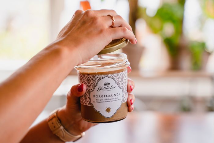 The popular Gottlieber praline Hüppen filling forms the basis for this creamy premium spread. It’s enhanced, by hand, with the addition of crunchy Hüppen pieces and the tiniest pinch of Swiss Alpine salt. The sleek design, enhanced by individual gold accents, is playfully rounded off by the fill level indicator on the side.