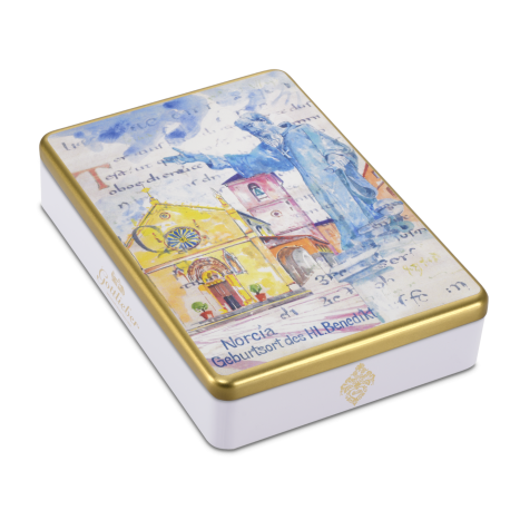 Discover taste and history in a unique collector’s tin: To mark the 1500th anniversary of the Rule of Saint Benedict, the exclusive «Norcia» tin, designed by the Foundation Benedict Lucerne, is now available featuring an artwork by the renowned artist Prof. Dr. Wolfgang Zwirner. The illustration depicts the picturesque Italian town of Norcia, the birthplace of Saint Benedict.
