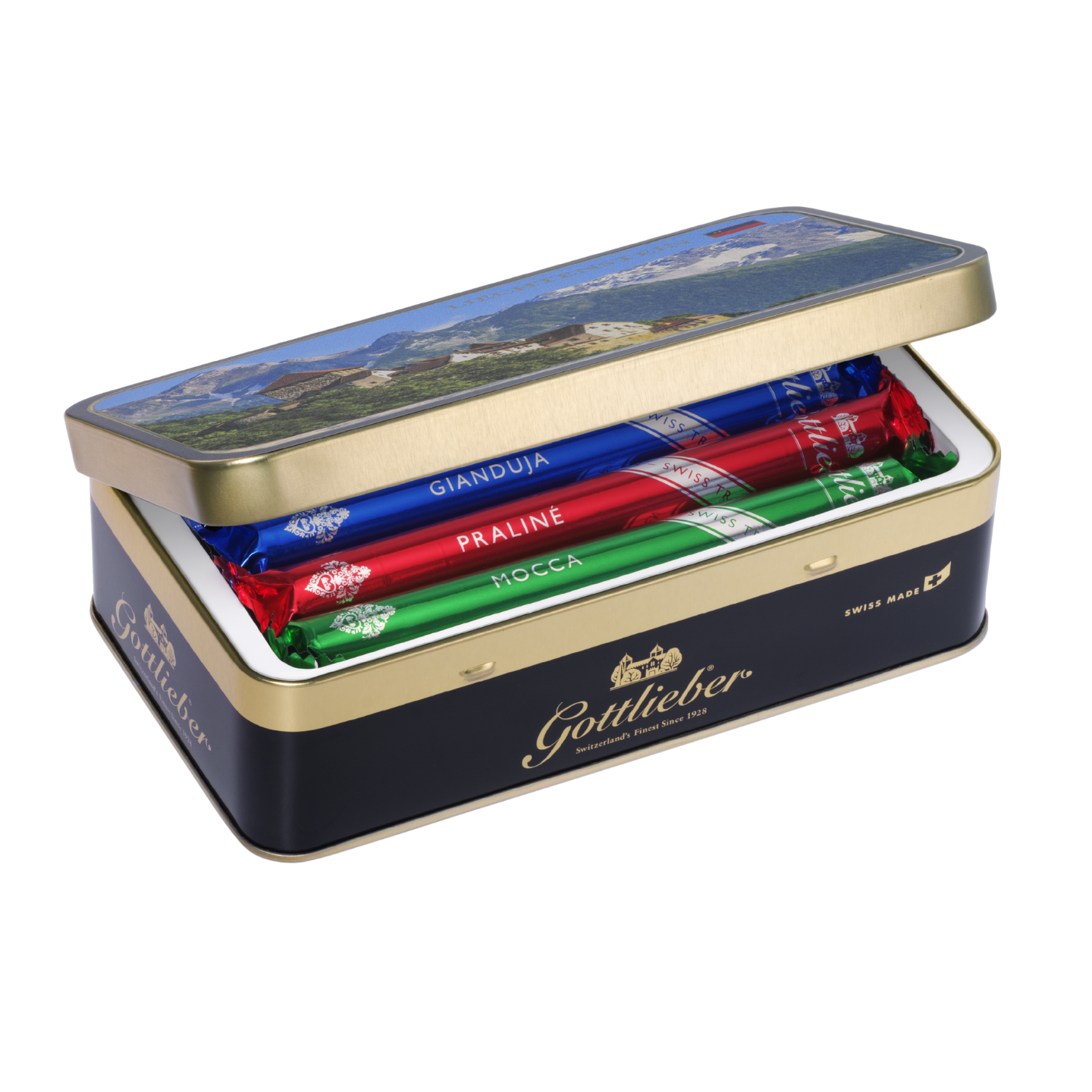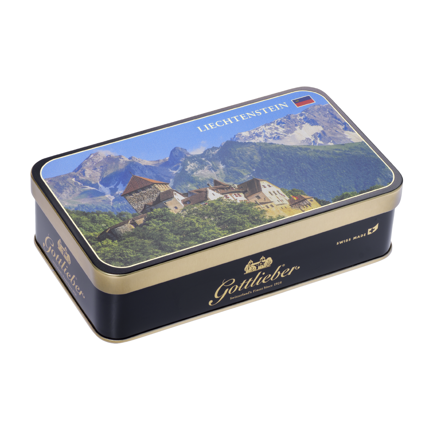 The elegant decorative tin featuring a picture of «Schloss Vaduz» contains a selection from the traditional assortment.