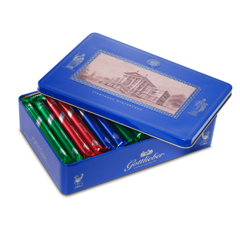 Semper City Hall in Winterthur is now also a tin with exquisitely beautiful embossing. Filled with 28 of the finest Gottlieber Hüppen from the traditional assortment (praline, mocha, gianduja).