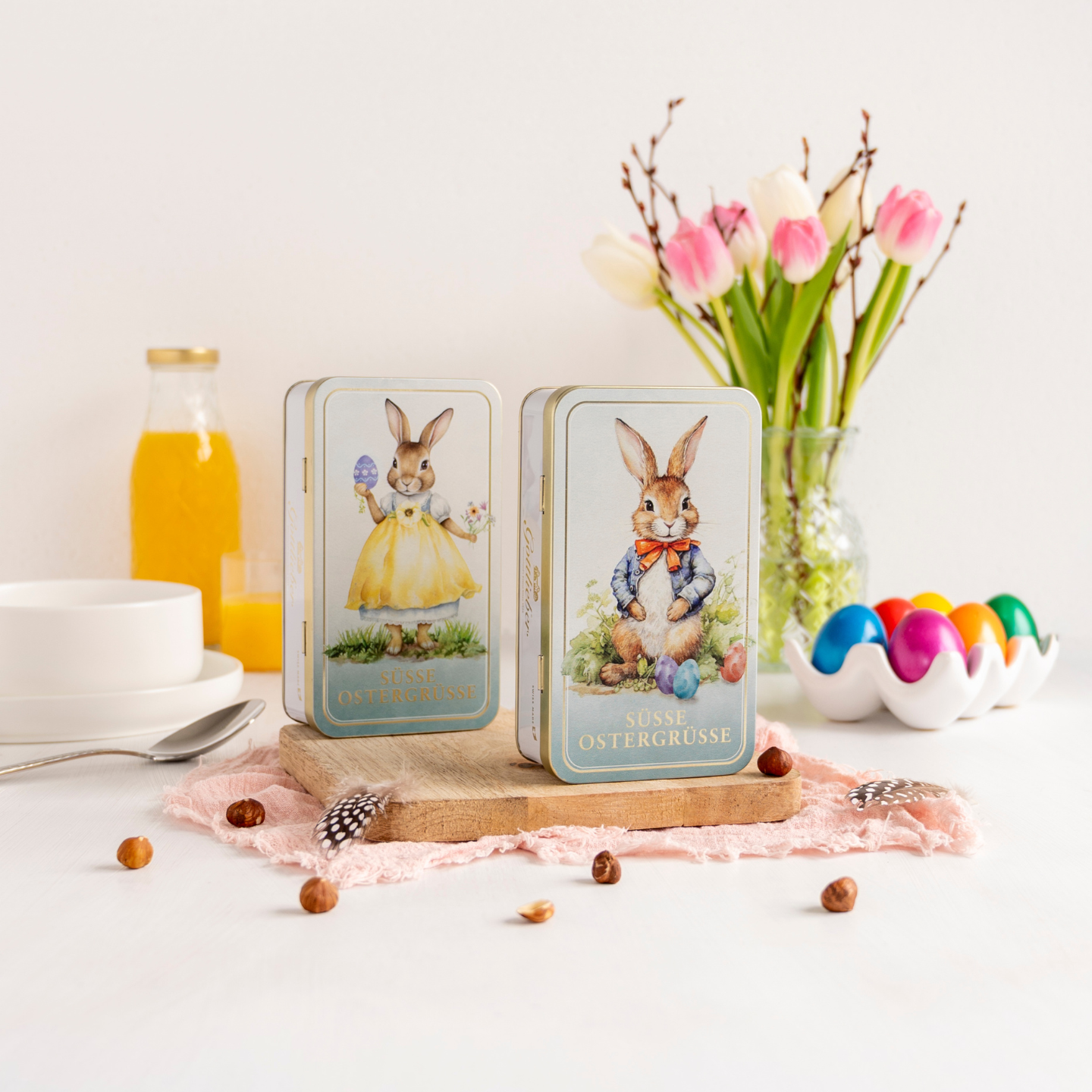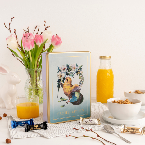 The Collector's Edition «Happy Easter» is a real highlight for anyone who loves Easter and collecting beautiful things. In this special edition, our finest Gottlieber Hüppen are paired with a sweet retro design that not only has a nostalgic feel, but also harmonises perfectly: The «Happy Easter» decorative tin (8 different Mini-Hüppen) and the new «Felix» & «Amélie» decorative tins with sweet Easter treats (10 Hüppen each from the traditional mix) complement each other wonderfully and together make a lovingly coordinated set. Ideal for collecting, giving as gifts or stylish decorating.