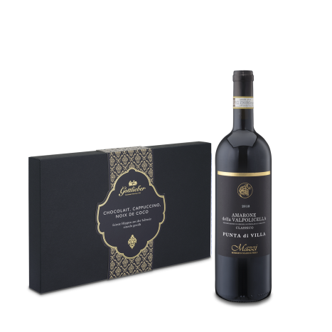 The «GRANDE Italia» gift set contains the GRANDE Royal edition with the three Hüppen variety Chocolait, Cappuccino and Noix de Coco as well as an Amarone della Valpolicella classico Punta di Villa DOCG.