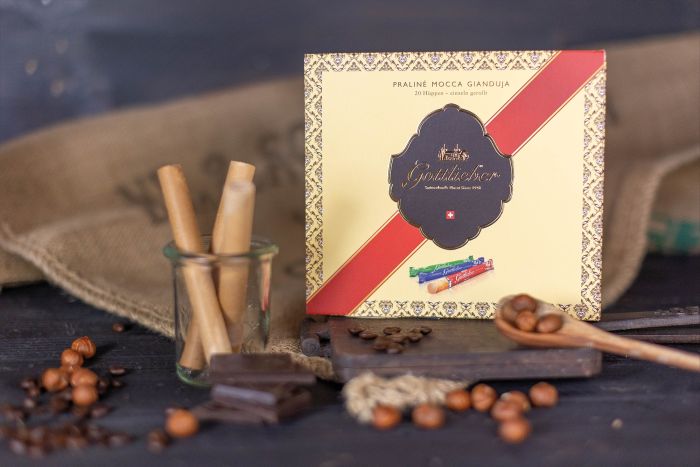 For many years now, our traditional Hüppen mix in red, green and blue has been popular with young and old alike and is by far Gottlieber's top-seller. The melt-in-your-mouth praline filling is made from roasted hazelnuts and premium cocoa paste. It's also the basis of the mocha filling which is then refined with the finest arabica coffee. Our gianduja filling will enchant you with its delightful taste of roasted hazelnuts, while enticing you with a coating of organic dark chocolate. Since January 2023, our fillings are even vegan and palm oil free.