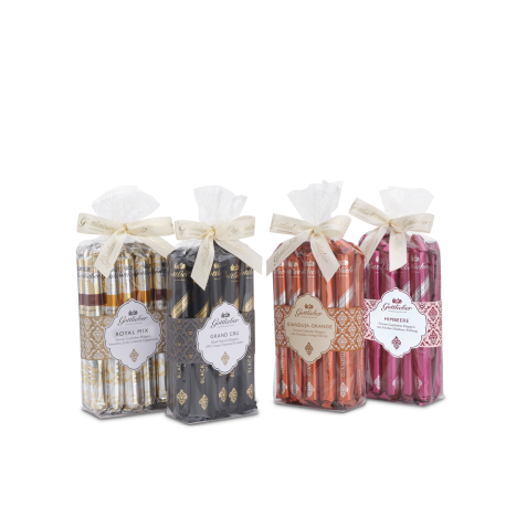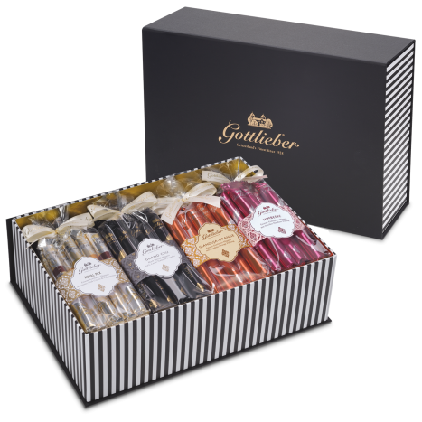 Decide spontaneously and according to your mood which of our four flavors in the Gottlieber treasure box «The pleasure of Hüppen» you particularly like to snack on and enjoy today. Raspberry and Cappuccino? Or Gianduja-Orange and Black Special Grand Cru?