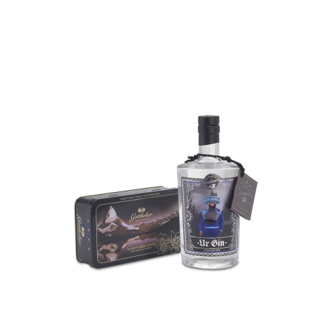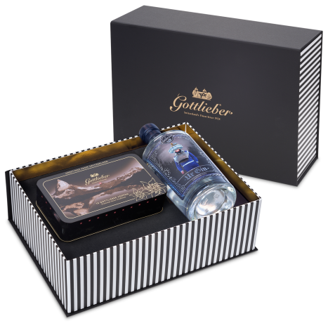 Ten of our finest Gottlieber Hüppen from the traditional mix (praline, mocha, gianduja) in a decorative tin «Switzerland I» and a traditional London Dry gin from Appenzeller Edelbrand Distillery combined in a lovely treasure box.