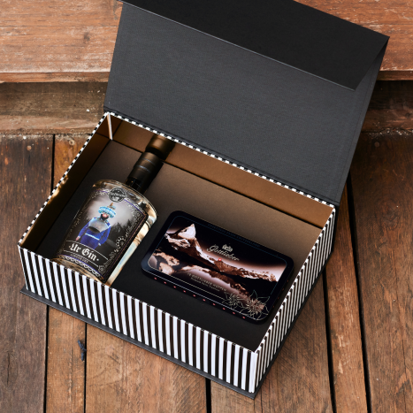 The elegant gift box of our «Gin» gift set with black and white stripes and gold inlay is made of sturdy cardboard with a magnetic closure and can be reused for various occasions. You can find a few upcycling ideas here. You can also get a first impression of the elegant box in our unboxing video of the Treasure Box No. 3: «We like it colorful».