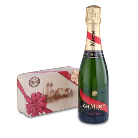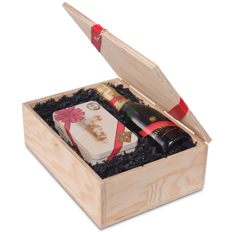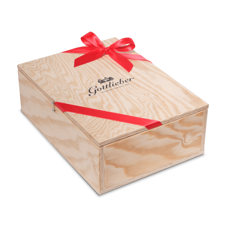 The Gottlieber wooden case with our decorative tin jubilee filled with 10 of the finest Hüppen of the traditional blend (praline, moccha, gianduja) and a bottle of sparkling Mumm champagne.