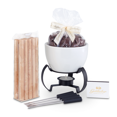 A chocolatey-sweet gift in a beautiful wooden box! The set contains everything you need for a cozy fondue: Tealight fondue bowl, tealight and matches, fondue forks, fine chocolate and unfilled Gottlieber Hüppen for dipping. The combination of crispy Gottlieber Hüppen and finest chocolate (52 % cocoa) guarantees a unique and exclusive enjoyment. Tip: Add fresh fruit for an even more heavenly temptation.