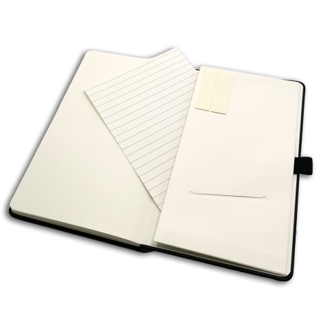 The notebook comes in a sophisticated black color and features high-quality paper that is perfect for writing, sketching or drawing. The black notebook can be closed with a black elastic band and has a practical pen holder.