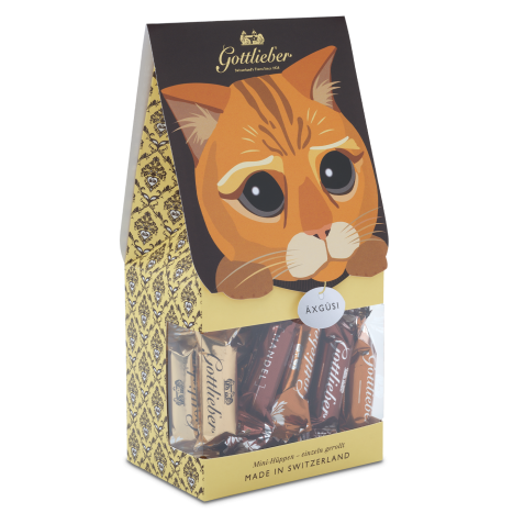 Likely the sweetest apology: Delicious Gottlieber mini Hüppen from our classic mix (vanilla, caramel, almond) with a kitten and the message «I am sorry».