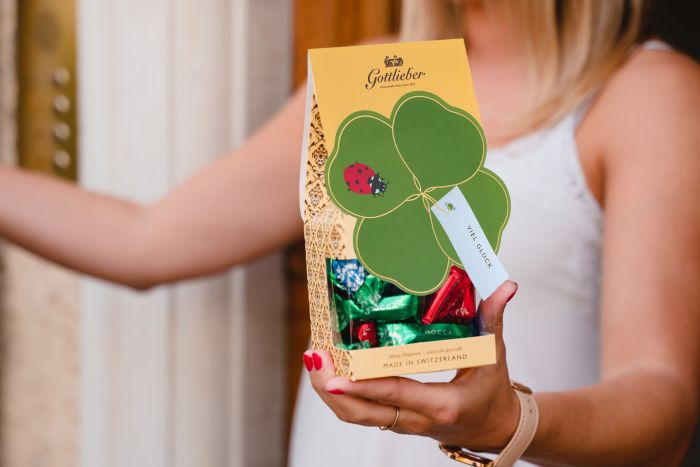 An original and sweet way to wish someone good luck: scrumptious Gottlieber mini Hüppen from our traditional mix (praline, mocha, gianduja) with a lovely four-leaf clover gift pack and the message «Good Luck». The label leaves room for personal notes and special dedications.
