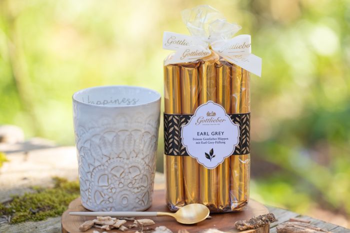 The aroma of our Earl Grey Hüppen is unmistakable and is reminiscent of the strong scent of black tea. The taste is dominated by bergamot, which provides a pleasant citrus freshness. Together with the crispy wafer, this creates a unique taste experience that will delight tea lovers.