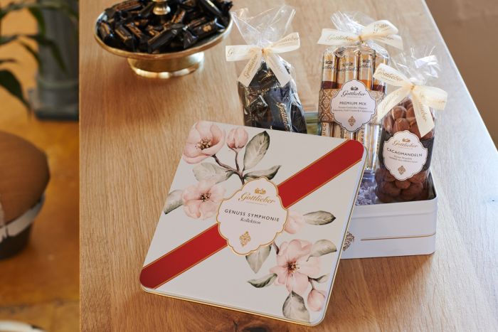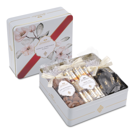 Magnificent magnolias in full bloom adorn our new «Delight symphony II» decorative tin. With its unobtrusive yet special design, it is an elegant gift or collector's item for all lovers of our Gottlieber specialties. The unique decorative tin is filled with Royal Mix Hüppen (Amaretto, Cappuccino & Irish Cream), Black Special Grand Cru Mini Hüppen and the finest Gottlieber cocoa almonds.
