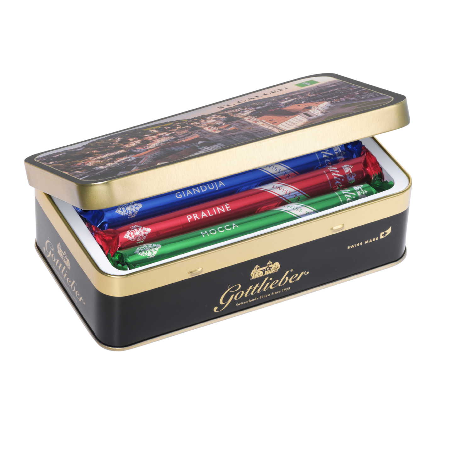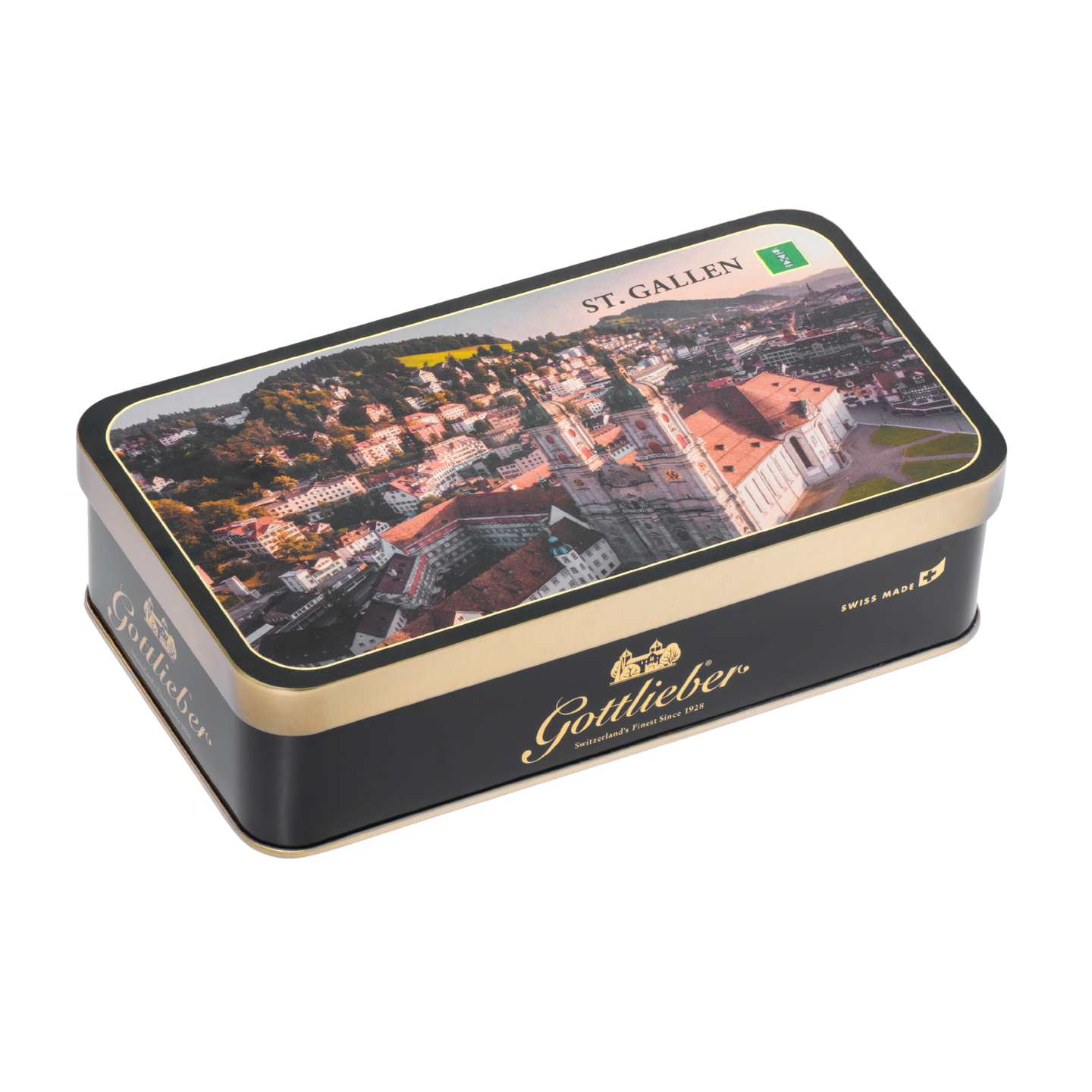 The elegant decorative tin featuring a picture of St. Gallen contains a selection from the traditional assortment.