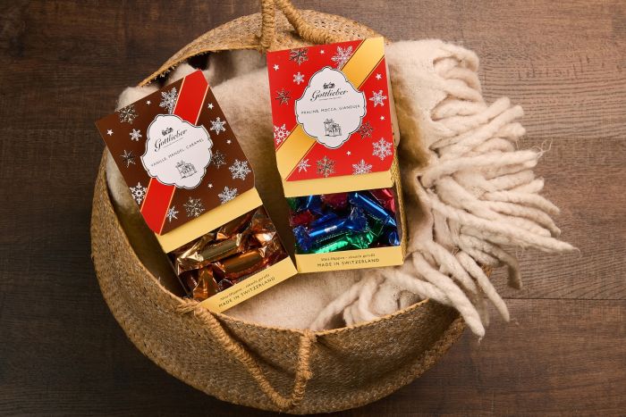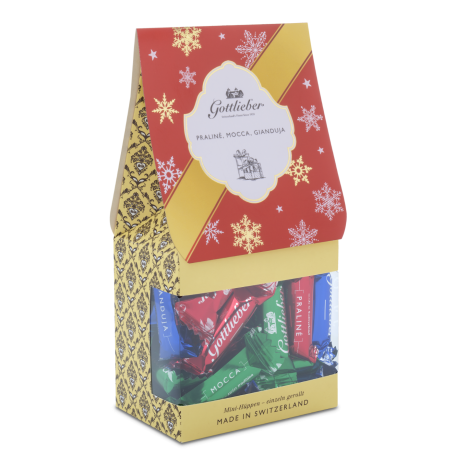 Delicious Gottlieber mini Hüppen of our traditional mix (praline, mocha, gianduja) in festive winter design.
