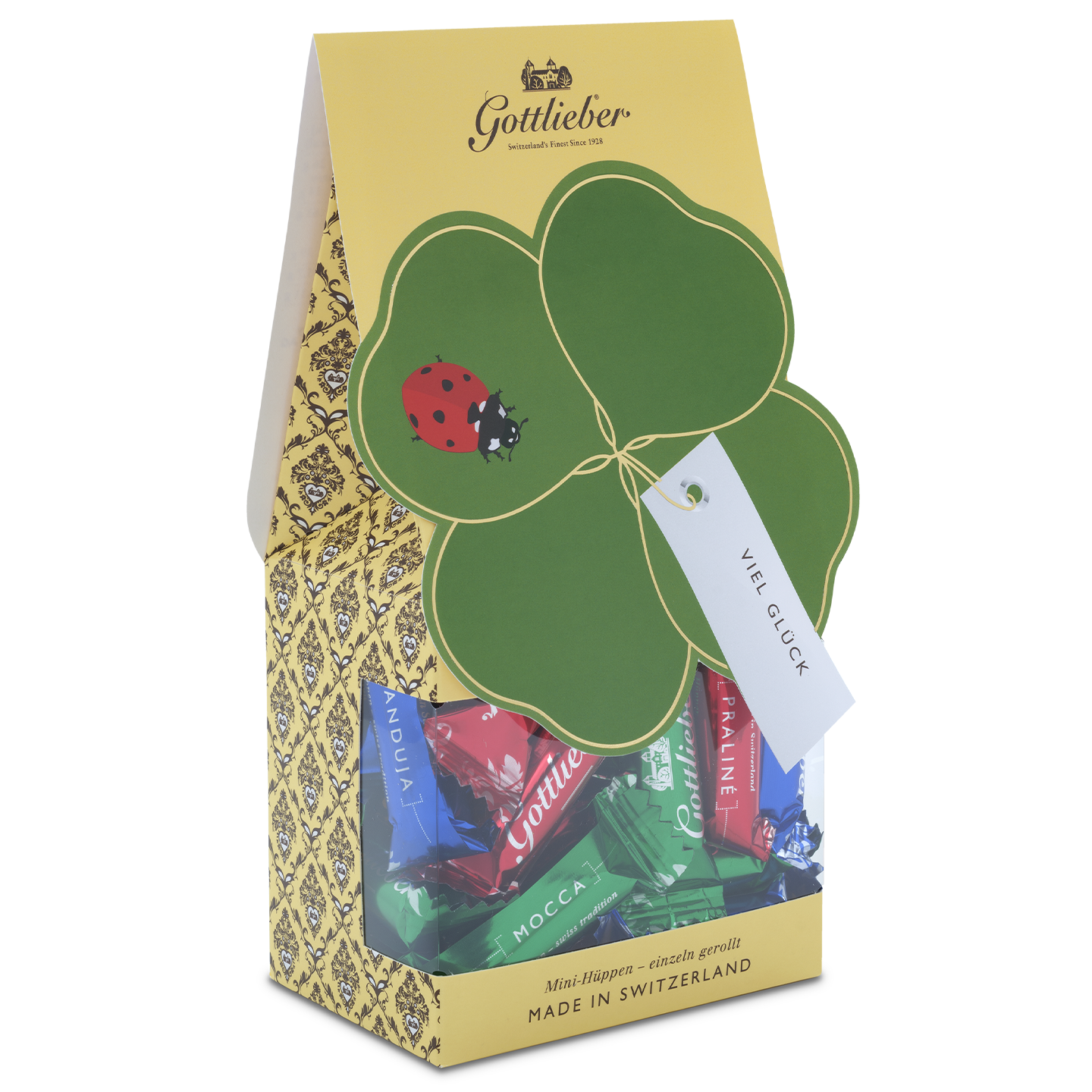 An original and sweet way to wish someone good luck: scrumptious Gottlieber mini Hüppen from our traditional mix (praline, mocha, gianduja) with a lovely four-leaf clover gift pack and the message «Good Luck». The label leaves room for personal notes and special dedications.